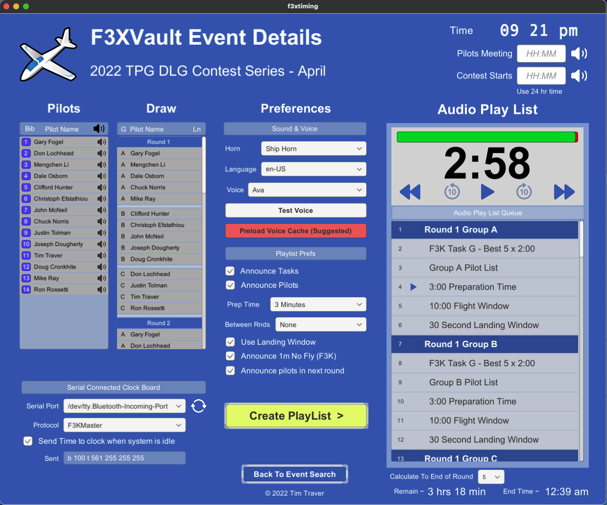 The search screen is also very simple. It allows you to search for events in the f3xvault system so that you can download the draw and pilots and create a playlist for that event. You can search on discipline type (f3k, f5j, etc), and you can also search for a string of the name of the event. Simply click on the row of the event you want to load, and it will take you to the main event screen.
